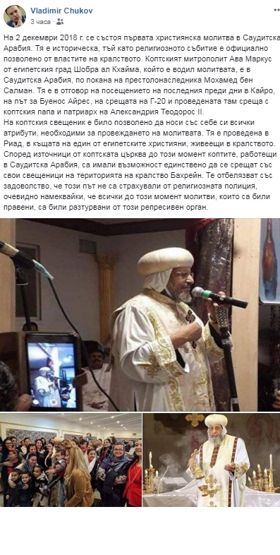 На 2 декември 2018 г. се състоя първата християнска молитва в Саудитска Арабия. Тя е историческа, тъй като религиозното събитие е официално позволено от властите на кралството. Коптският митрополит Ава Маркус от египетския град Шобра ал Кхайма, който е водил молитвата, е в Саудитска Арабия, по покана на престолонаследника Мохамед бен Салман. Това написа на страницата си във Фейсбук арабистът Владимир Чуков.