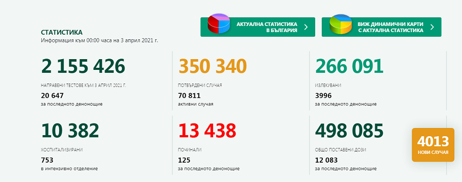 4013 са новозаразените с коронавирус у нас за последното денонощие, показва справката на Единния информационен портал, обновен с данните от изследваните през вчерашния 2 април, видя ПИК.