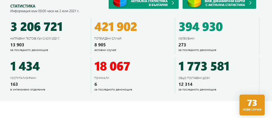 ПЪРВО В ПИК: 73 са новите заразени, а излекуваните 273. За последните 24 часа са поставени 12 314 ваксини (ТАБЛИЦА)
