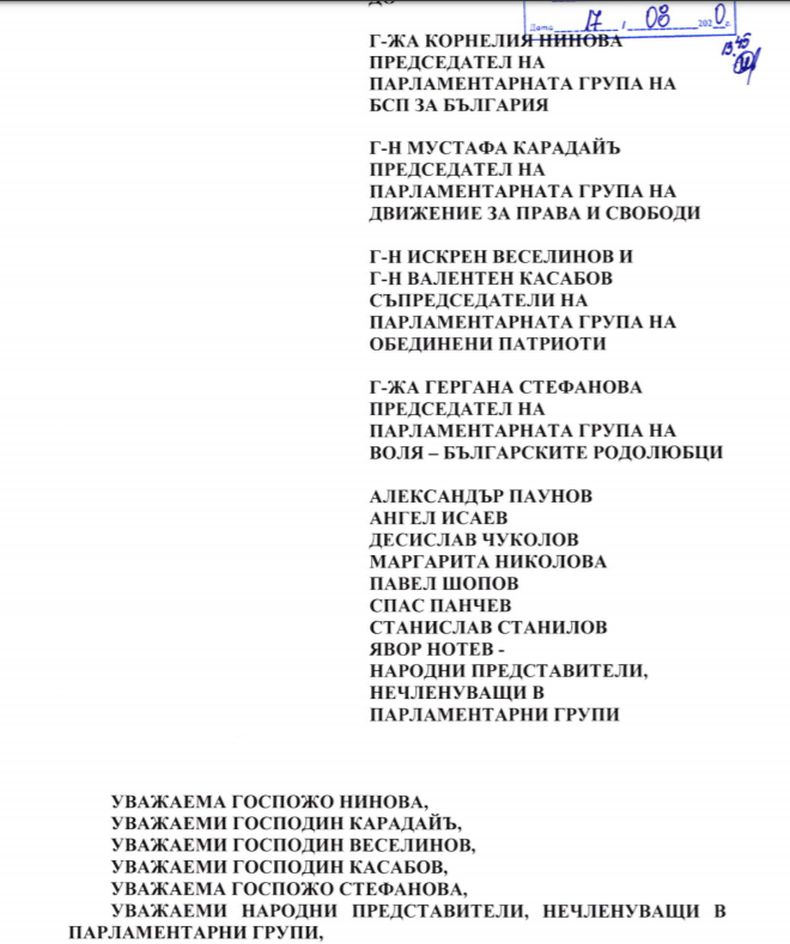 Документът е изпратен до председателите на всички парламентарни групи в 44-тото Народно събрание и депутатите, нечленуващи в парламентарни групи.