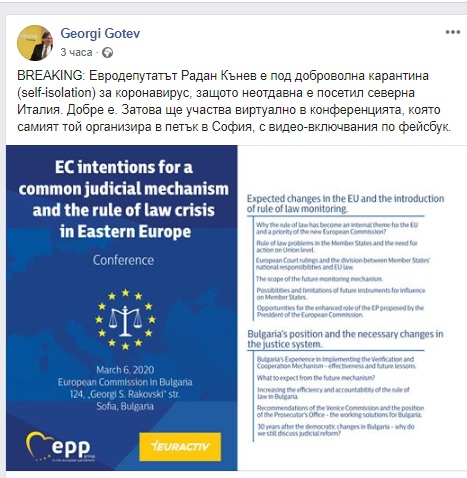 Радан Кънев е под карантина заради коронавируса. Тази сърцераздирателна новина за проваления психодесен лидер, влязъл по милост в европарламента след странни изчисления от страна на ЦИК, съобщил във фейсбук съветник на негов колега, при това от БСП. Става въпрос за Георги Готев, който преди дни участва в Брюксел в провокация срещу премиера Бойко Борисов, разпространявайки менте новината на Елена Йончева за къщата в Барселона. После се оказа, че въпросният Готев действа съвсем не случайно, а си е свързан и финансово с БСП - като съветник на евродепутата от БСП и колега на Йончева Иво Христов.