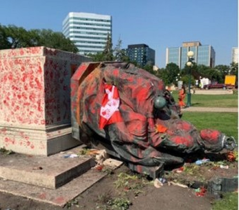 Първо бе съборен паметникът на кралица Виктория пред сградата на парламента на провинция Манитоба, чиято столица е Уинипег. Множеството приветства падането на статуята на земята, а после хората започнаха да танцуват около нея и да я ритат. Някои демонстранти боядисаха дланите си с червена боя и после ги избърсаха в монумента, създавайки кървави отпечатъци.