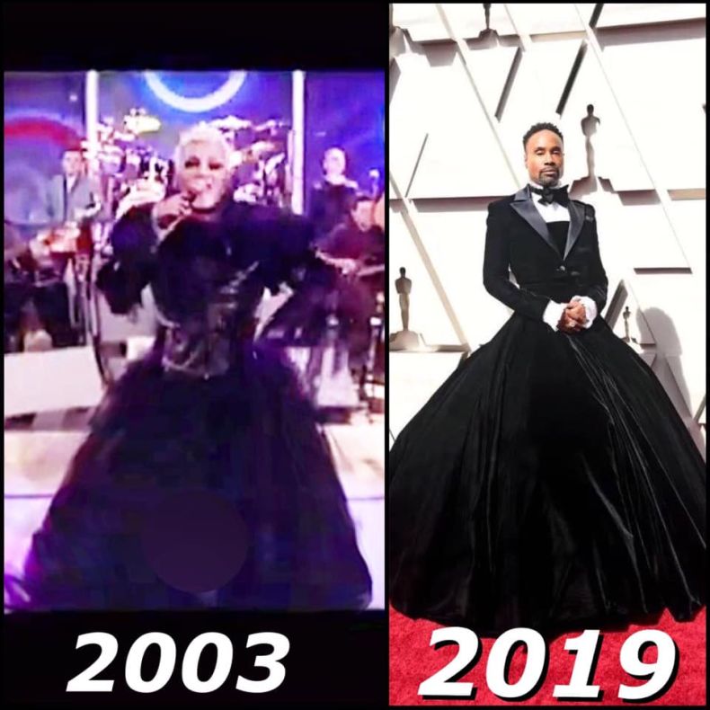 Втори ден световните медии се надпреварват да пишат за актьора Били Портър. На церемонията за раздаването на тазгодишните награди "Оскар" той дефилира по червения килим с дреха на дизайнера Кристиан Сириано. Моделът представлява съчетание между фрак и рокля.