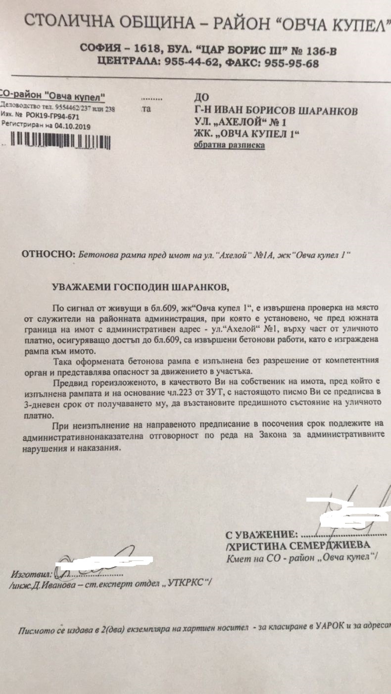 Единият е Иван Шаранков, за когото е известно, че незаконно си е бетонирал терена около къщата , в която живее. (ВИЖТЕ ДОКУМЕНТА). Според кметицата на "Овча купел" , той изградилбетонова рабма на имот на ул. "Ахелой" 1 върху уличното платно.