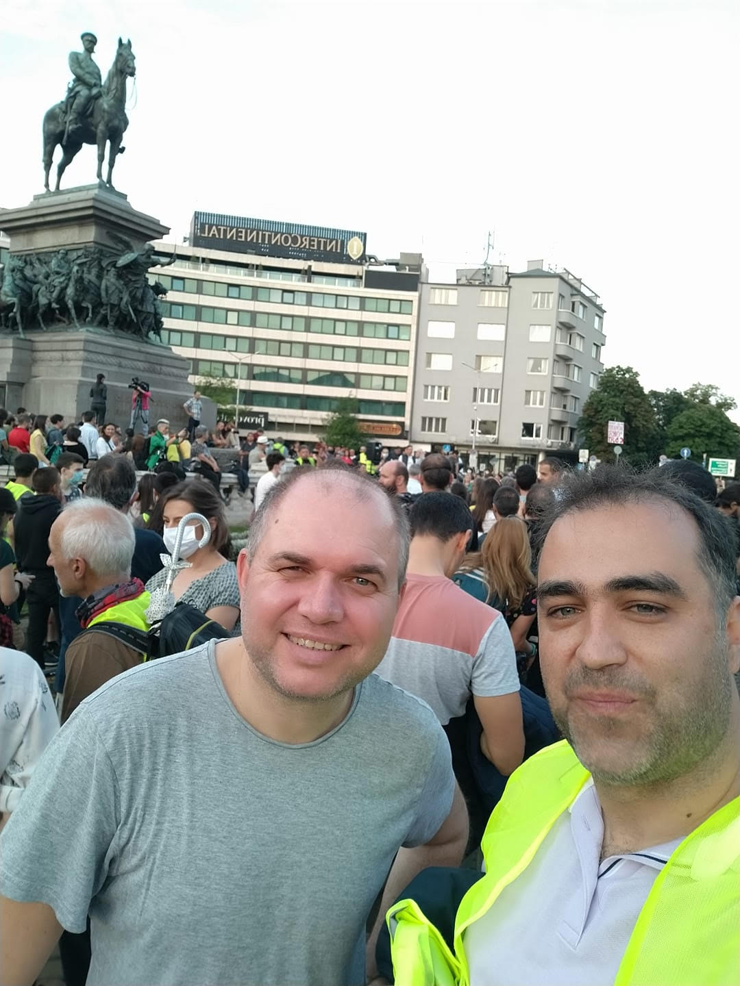 Шарков, който не пропуска да демонстрира близостта си с кандидати за депутати от ДеБъ в социалните мрежи (вижте по-долу как Шарков с жълтата жилетка позира до водача на листа Владислав Панев), бил нает от ЦИК във връзка с програмирането на електронните устройства за гласуване.