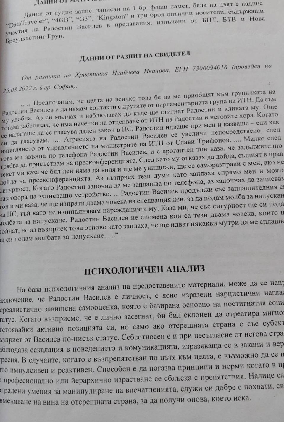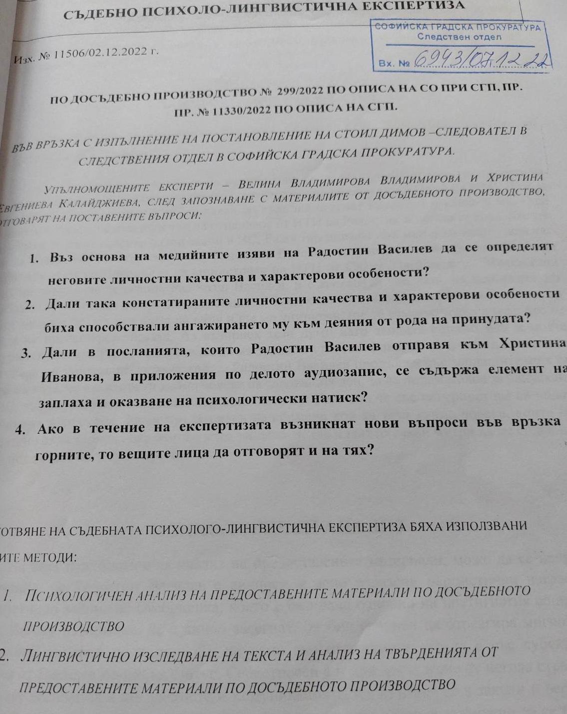Експертизата на Радостин Василев е по досъдебно производство № 299/22 г., по което Радостин Василев е проверяван и разследван за отправени от него на 13 юни 2022 година заплахи, с които се е опитал да принуди депутатката Христинка Иванова да напусне парламентарната група на "Има такъв народ" и 47-ото Народно събрание.