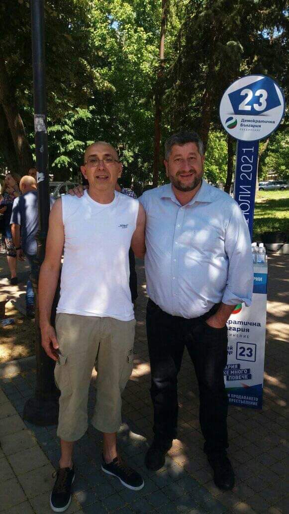 Другият кадър, който се разпространява в социалните мрежи е снимка на Христо Иванов с Мирослав Йонков. Тя е направена по време на кампанията за предсрочния вот на 11 юли 2021 г.