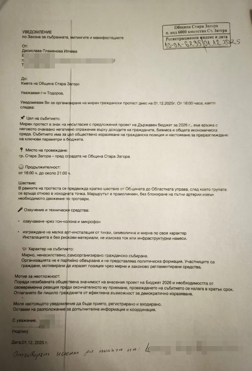 Десислава Пламенова Илчева е подписала уведомлението до кмета за събитието: