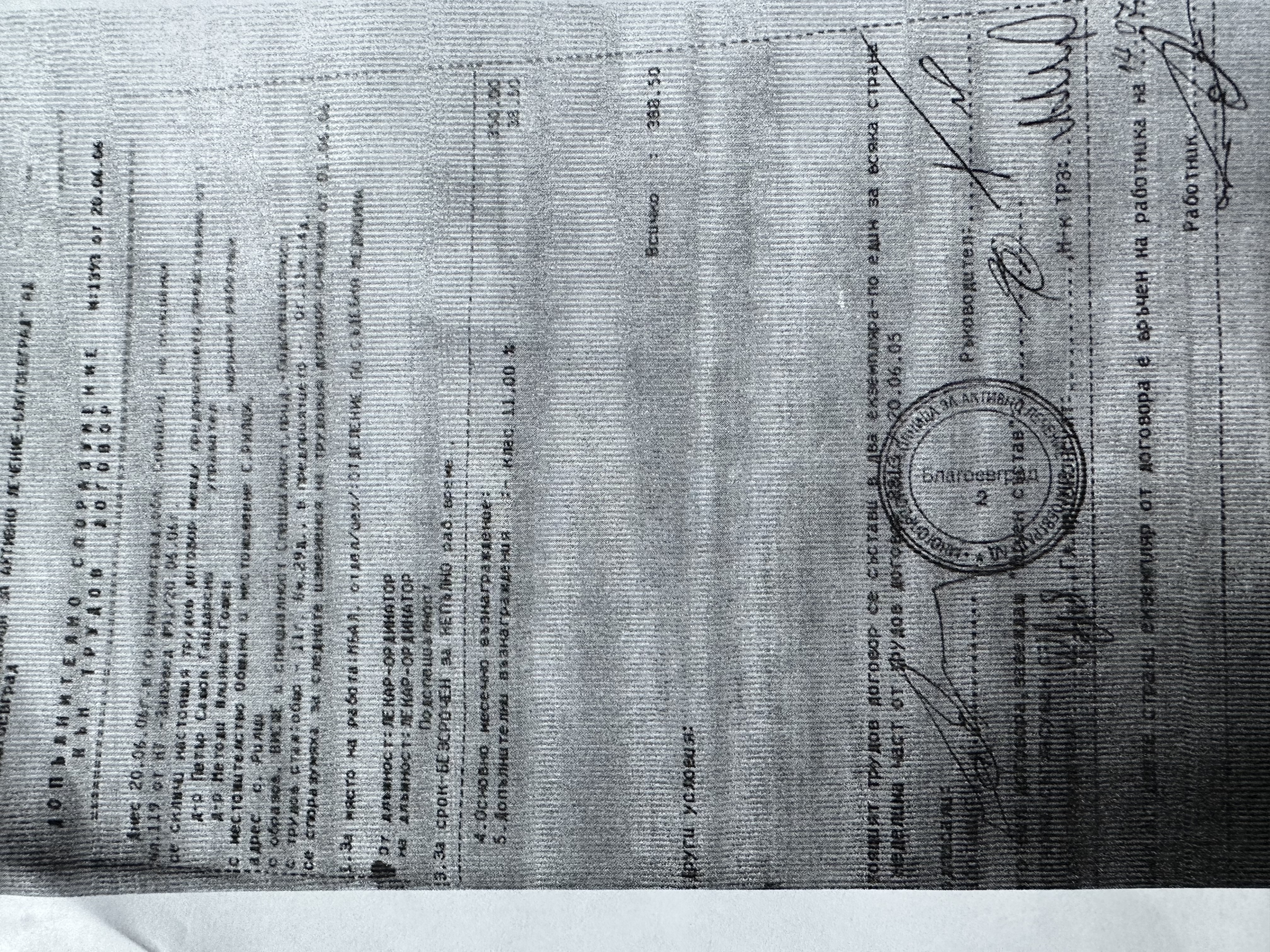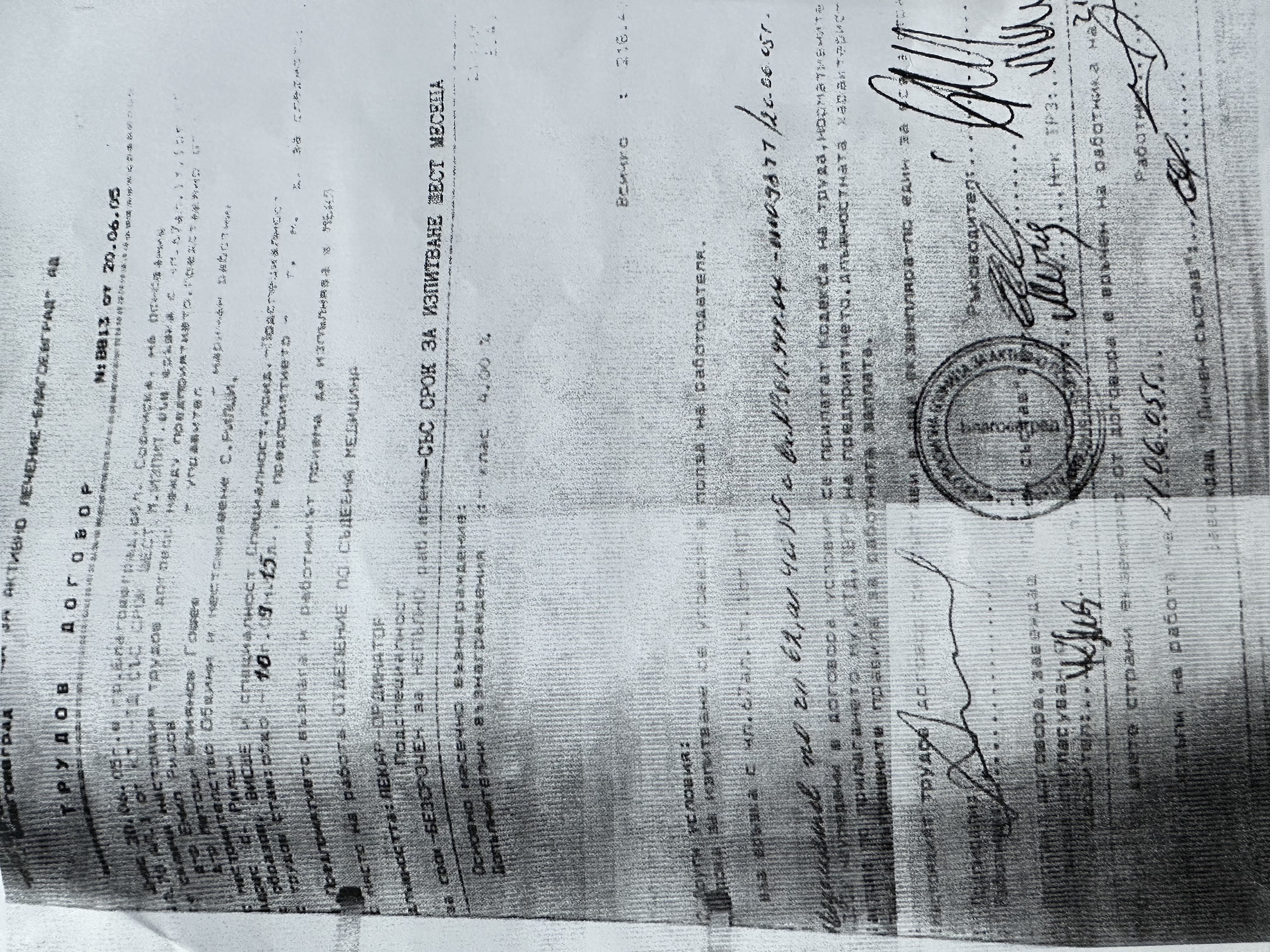 Подписан е трудов договор №8813 от дата 20.06.2005 г., където посоченият трудов стаж е поправен на ръка от 5 г. и 5 месеца на 10 г., 9 месеца и 15 дни.