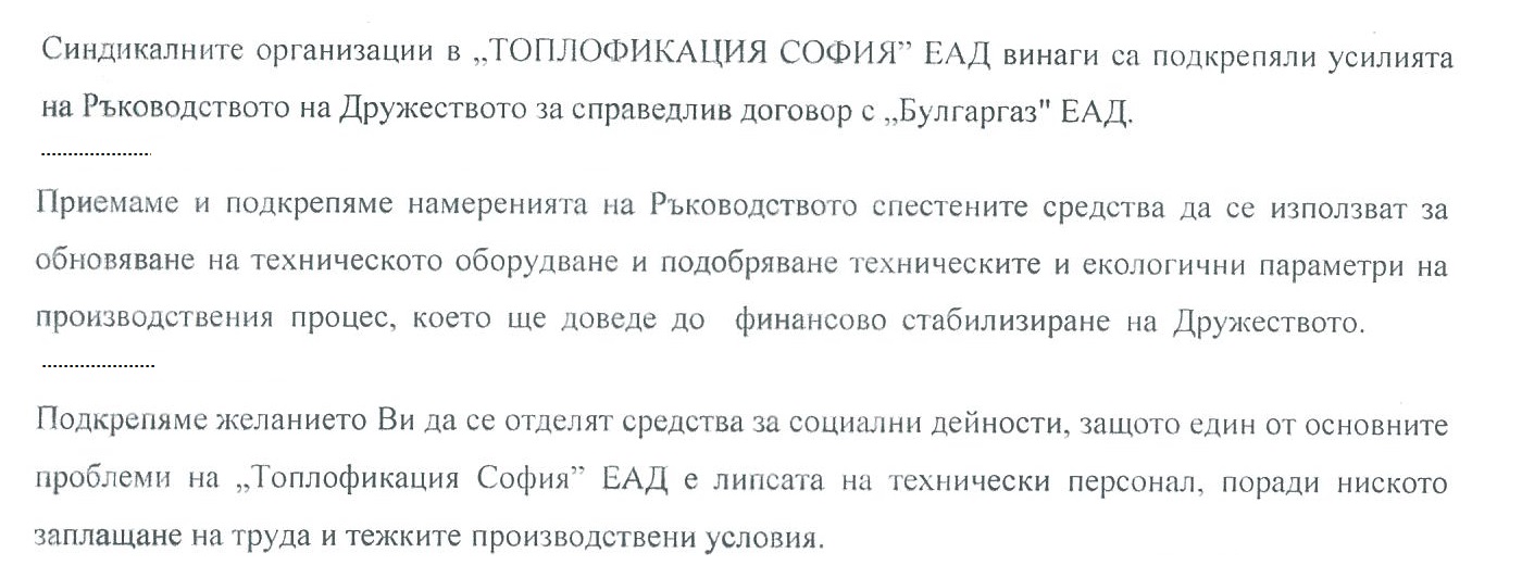 В писмото си, синдикатите подкрепят усилията на ръководството за осигуряване на конкурентни условия по договора. Желанието им е спестените средства да се използват за модернизация, обновяване на техническото оборудване и подобряването на условията на труда.