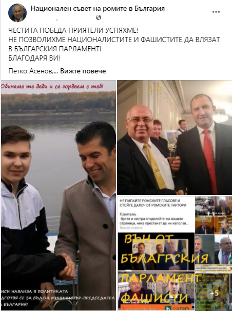 Става дума за Национален съвет на ромите в България, чиито председател Петков Асенов съвсем нескрито честити успеха на изборите на събратята си. За да няма неразбрали, той е публикувал и свой приятелски кадър с Румен Радев на по чашка, на който двамата усмихнати се ръкуват.