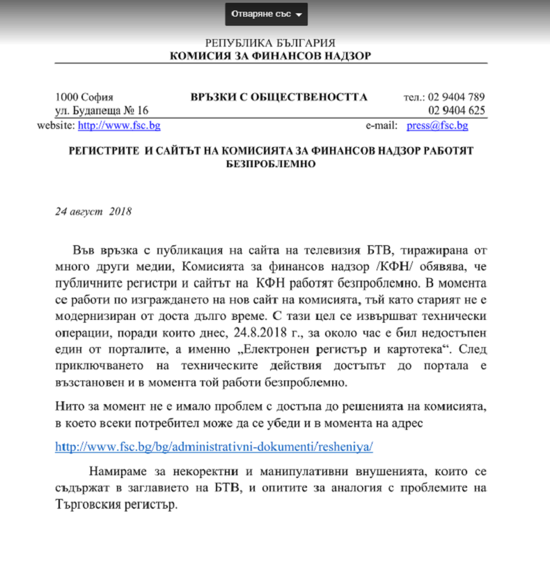 "Във връзка с публикация на сайта на телевизия БТВ, тиражирана от много други медии, Комисията за финансов надзор /КФН/ обявява, че публичните регистри и сайтът на КФН работят безпроблемно. В момента се работи по изграждането на нов сайт на комисията, тъй като старият не е модернизиран от доста дълго време.
