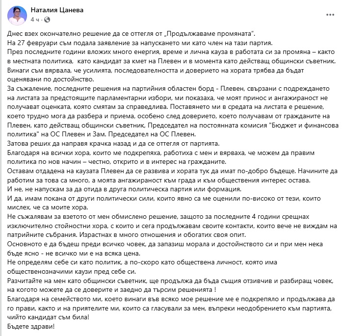 Това пише във фейсбук Наталия Цанева, член на "Продължаваме промяната" и общински съветник в община Плевен.