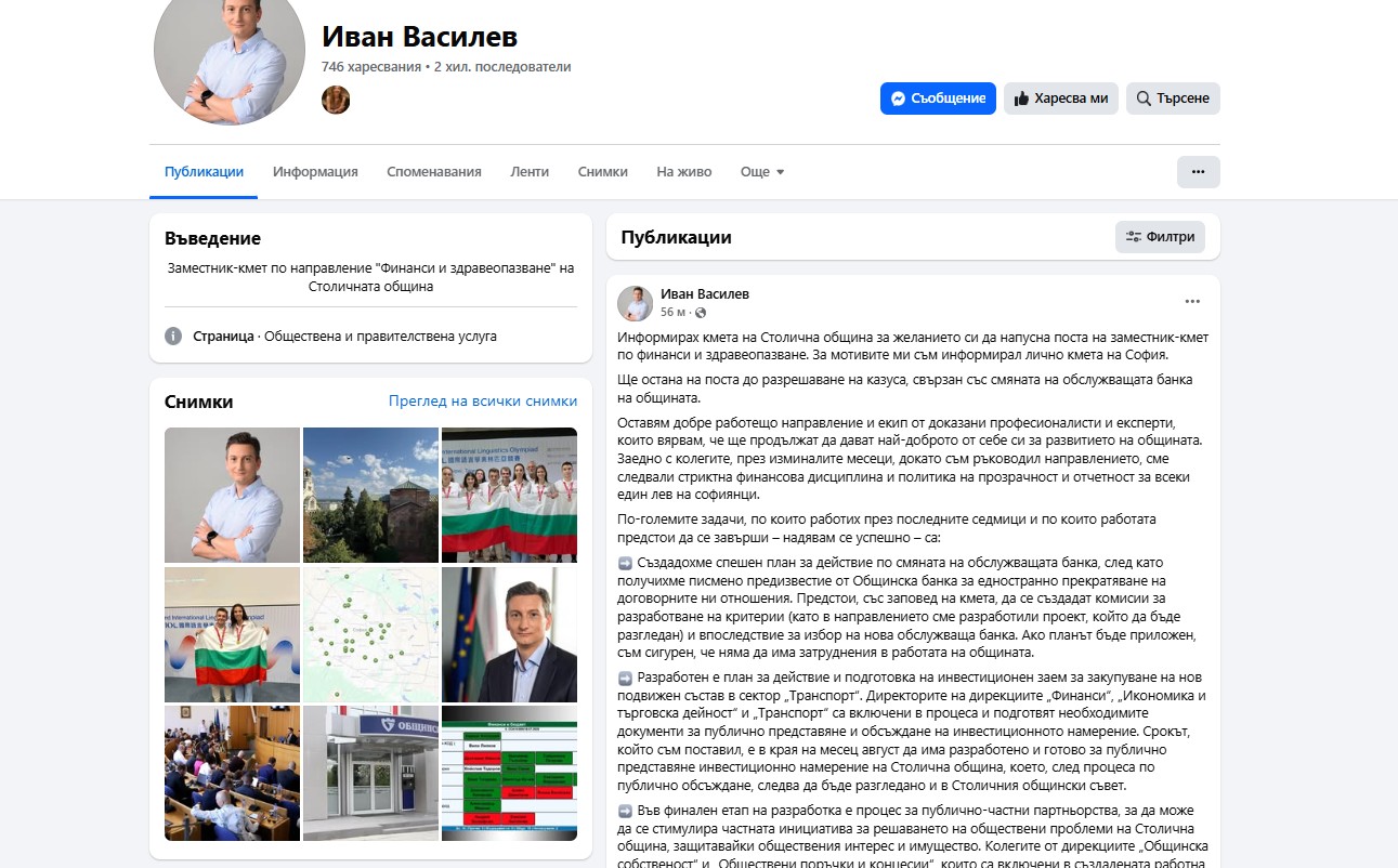 "Информирах кмета на Столичната община за желанието си да напусна поста на заместник-кмет по финанси и здравеопазване. За мотивите ми съм информирал лично кмета на София. Ще остана на поста до разрешаване на казуса, свързан със смяната на обслужващата банка на общината", посочва днес Иван Василев в пост във Фейсбук.