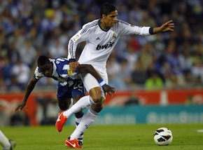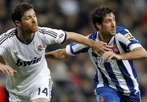 В началото футболистите на "Еспаньол" опитаха няколко интересни атаки към вратата на Диего Лопес, но първата голова ситуация бе в актива на "Реал". Младият Мората бе изведен на стрелкова позиция и само добрата намеса наФрансеск Касийя му попречи да открие резултата. В 19-ата минута игралият до момента като десен бек Рафаел Варан се контузи и бе заменен от Чаби Алонсо. Испанският национал зае традиционното си място в средата на терена, а Есиен се върна в защита.