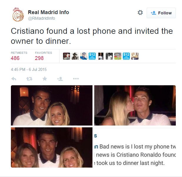 Историята бе разкрита от млада жена, която публикува в социалната мрежа Instagram свои снимки с Кристиано Роналдо.