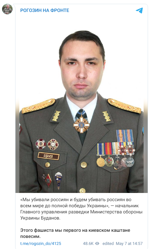 Дмитрий Рогозин, един от най-близките хора на президента Владимир Путин, заяви, че Русия ще обеси шефа на украинското разузнаване Кирило Буданов в Киев.