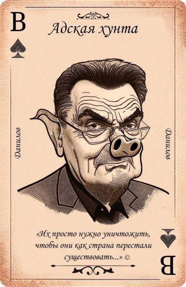 Руският пропагандист Сергей Карнаухов, който е включен в санкционния списък на Украйна, публикува в Telegram колода карти за игра с пародийни изображения на украински политици и военни. „Колодата на Адската хунта е в кървавите ръце на западните измамници“, е написал в поста си Карнаухов с препратка към оскърбителното наименование, което руската пр