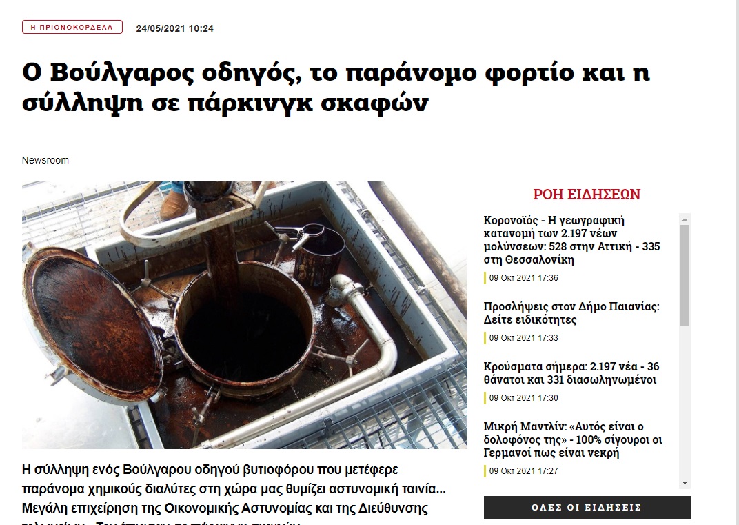 Преди месеци гръцките медии алармираха за друг случай, който не беше отразен широко у нас (Статията можете да видите ТУК!). Арестуван беше български шофьор на цистерна, който е транспортирал незаконно химически разтворители в Гърция, които се използват за производство на фалшиви горива. Този конкретен бизнес е голям и зад него се крие голяма верига от нелегален трафик на гориво, отбелязват гръцките журналисти.