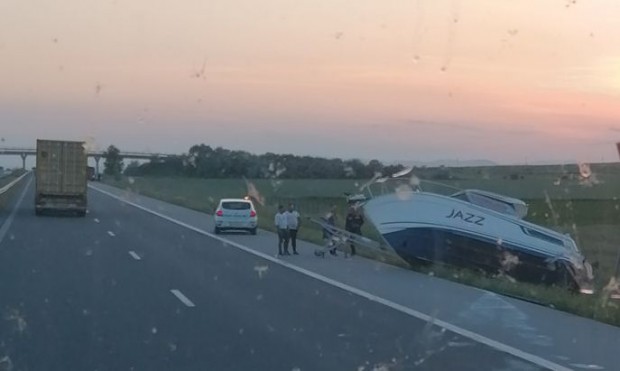 РЯДКО СРЕЩАН ИНЦИДЕНТ: Автомобил, превозващ яхта, се преобърна на магистрала "Тракия" (СНИМКА)