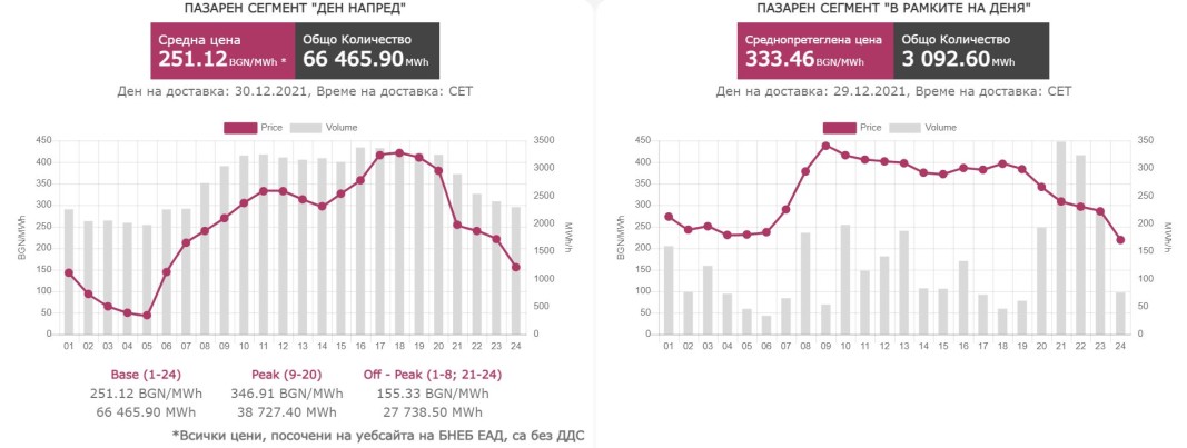 На пазарния сегмент "в рамките на деня" на БНЕБ среднопретеглената цена на тока в сряда (29-ти декември) достигна 333,46 лева за MWh, като най-големите обеми изтъргуван ток се осъществиха в ценови диапазон между 285 и 308 лева за мегаватчас.