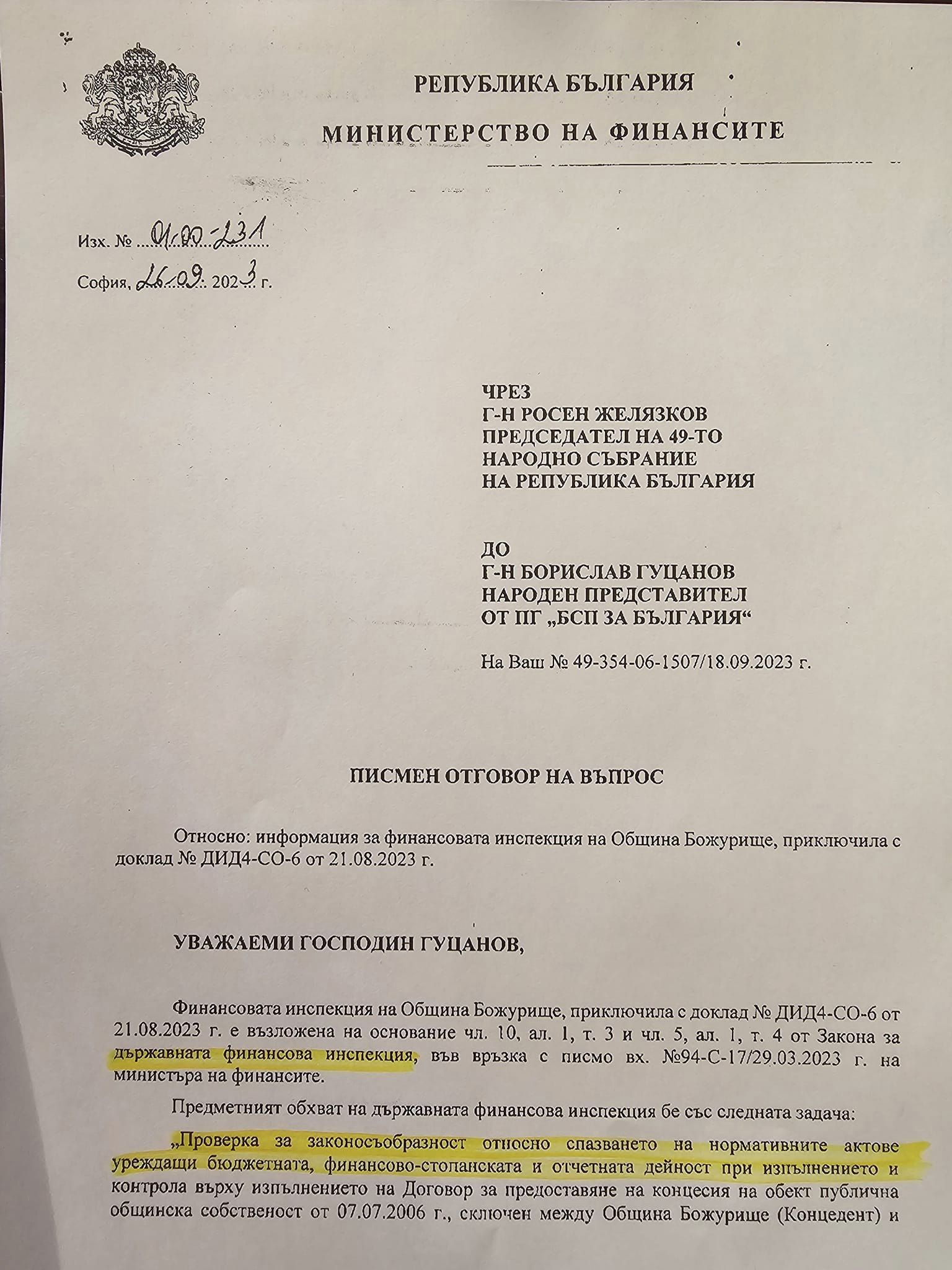 Видно от документите, които Славчев прилага и които представляват отговор от Асен Василев на въпрос на депутата от БСП Борислав Гуцанов, финансовото министерство категорично установява, че концесията на конната база не се спазва.