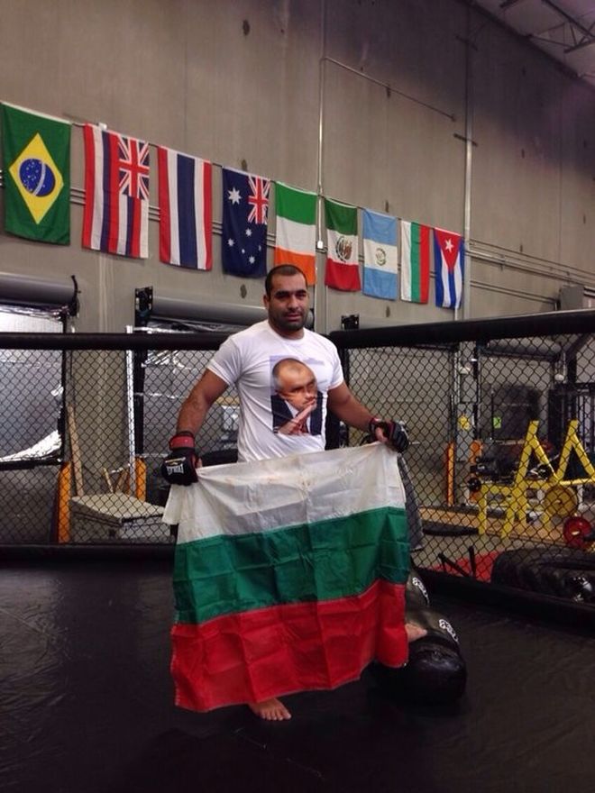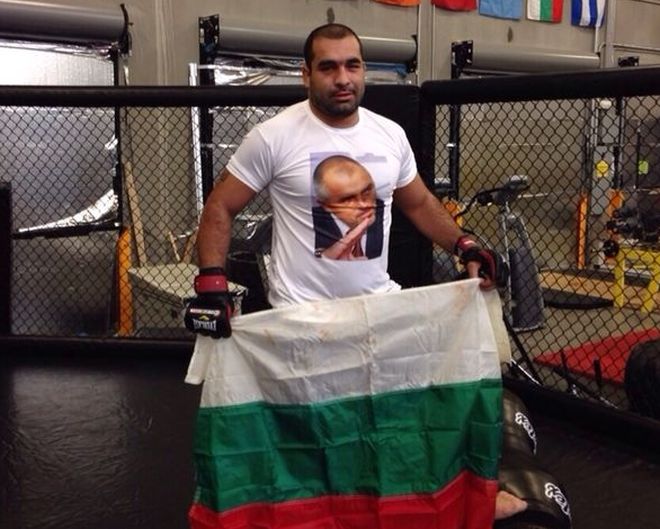 Най-известният български ММА-боец Благой Иванов позира пред американските медии с фланелка с лика на Бойко Борисов, след като победи Лавар Джонсън и се класира за финала в тежка категория на веригата "Bellator".