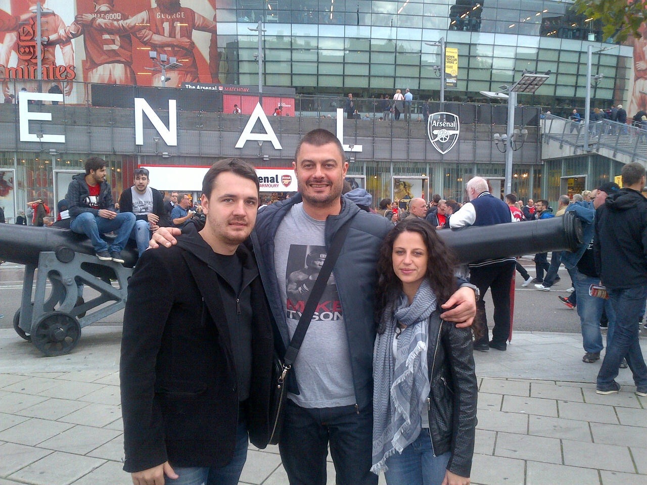 Бареков с жената до себе си Мария Календерска и колегата си Мартин Иванов пред стадион "Емирейтс".