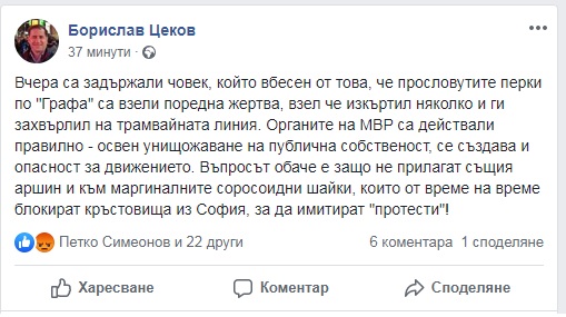 "Вчера са задържали човек, който вбесен от това, че прословутите перки по "Графа" са взели поредна жертва, взел, че изкъртил няколко и ги захвърлил на трамвайната линия. Органите на МВР са действали правилно - освен унищожаване на публична собственост, се създава и опасност за движението", написа Цеков на страницата си във Фейсбук.