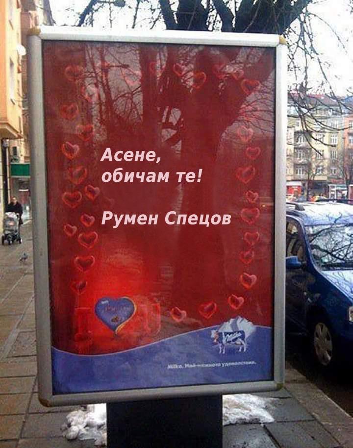 "Асене, обичам те. Румен Спецов", пише на рекламното пано на известна марка шоколад.