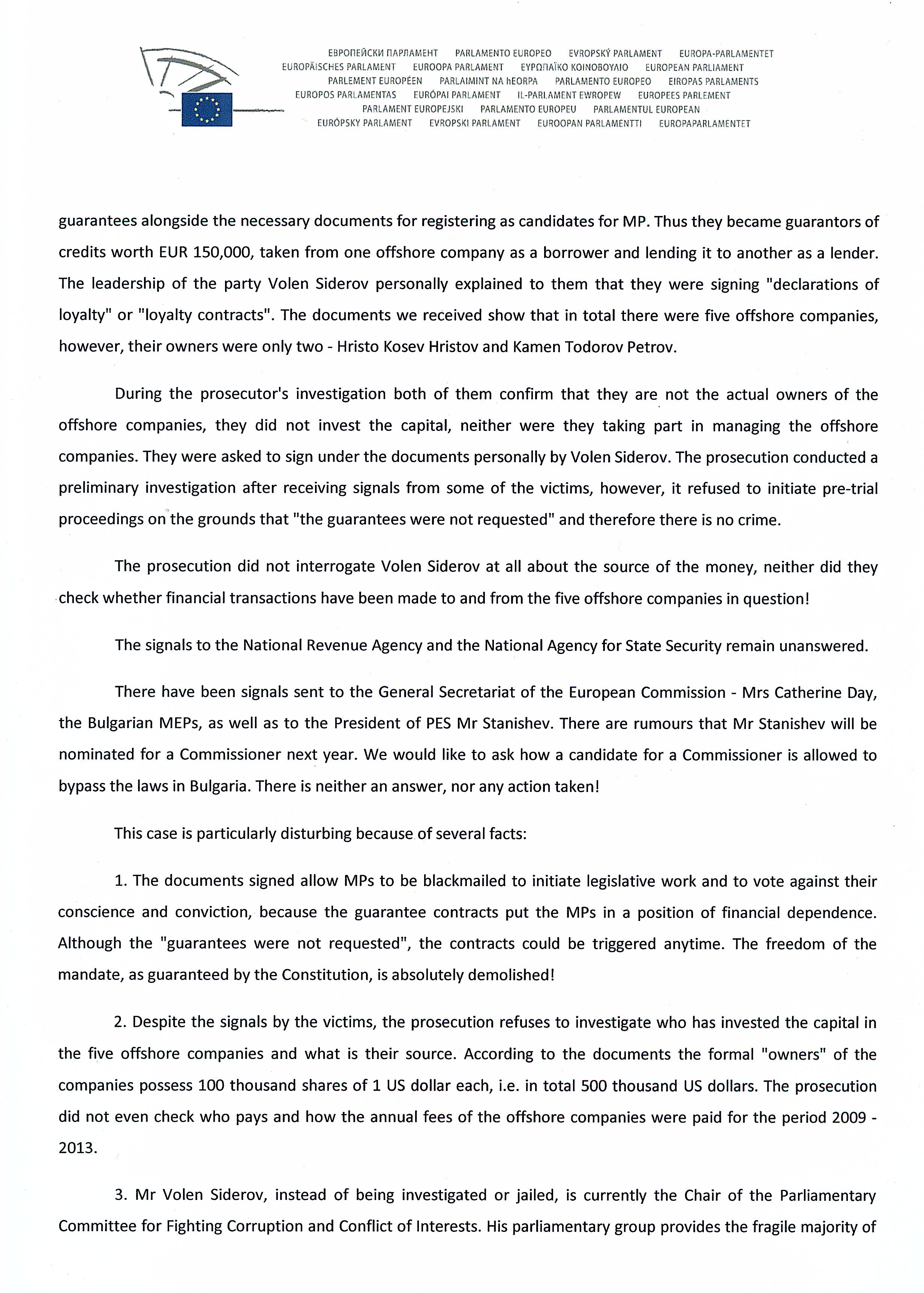 къпи дами и господа, ние ви пишем, защото до нас достигна много смущаваща информация от България. Бяхме информирани, че през 2009-та година най-малко 39 кандидат-депутати от листата на ПП  Атака са подписали гаранции за кредит от една офшорна компания към друга. 17 от тях по-късно стават народни представители през същата година. Както може да види от документите, които ние получихме, кандидат-депутати са събрани в централата на ПП Атака на 12 и 13 юни 2009 г., малко преди изтичане на крайния срок за представяне на кандидат-депутатските листи през същата година. Там, според техните изявления, те са били подведени да подпишат по-горе споменатите кредитни гаранции, заедно с необходимите документи за регистрация като кандидати за народни представители. По този начин те са станали гаранти за кредити на стойност 150 хил. евро, взети от една офшорна компания като взаимополучатели и предоставени на друга като взаимодатели. Ръководството на партията и лично Волен Сидеров са обяснили на кандидат-депутатите, че та подписали декларации или договори за лоялност. Документите, които ние получихме, показват, че има общо пет офшорни компании, но всъщност техните собственици са двама - Христо Косев Христов и Камен Тодоров Петров. По време на прокурорското разследване и двамата потвърждават, че всъщност те не са действителните собственици на офшорните компании, те не са инвестирали капитал, нито пък са вземали участие в управлението им. Те са били помолени да се подпишат под документите лично от Волен Сидеров. Прокуратурата е провела предварително разследване след получаване на сигналите на част от жертвите, но всъщност е отказала да даде началото на досъдебно производство на базата на това, че гаранциите не са били поискани и следователно липсва извършено престъпление. От прокуратурата обаче не са разпитали Волен Сидеров за източника на парите, нито са направили проверка дали са били осъществени финансови транзакции към и от тези пет офшорни компании. Сигналите до НАП и ДАНС са останали без отговор. Сигнали са били изпратени до генералния секретар на ЕК Катрин Дей, български евродепутати, и до президента на ПЕС Сергей Станишев. Има слухове, че г-н Станишев ще бъде номиниран за еврокомисар следващата година. Бихме искали да попитаме как кандидат за еврокомисар си позволява да не взема под внимание законите в България. Няма нито отговор, нито  някакви предприети действия. Случаят е особено обезпокояващ, поради няколко факта. Първо – подписаните документи позволяват депутатите да бъдат изнудвани да предприемат определена законодателна дейност, да гласуват против тяхната  съвест и убеждения, защото тези договори за гаранция поставят народните представители в позиция на финансова зависимост. Независимо от факта, че гаранциите  не са били поискани, те могат да бъдат задействани по всяко време. Свободата на мандата, както е гарантирано от Конституцията, е абсолютно унищожена. Второ – независимо от сигналите, подадени от жертвите на това деяние, прокуратурата отказва да разследва кой е инвестирал капитала в тези пет офшорни компании и какъв е техния източник. Според документите официалните им собственици притежават по 100 хиляди акции, всяка на стойност 1 щатски долар или общо 500 хил. щатски долара. От прокуратурата дори не са проверили кой плаща и как са бил
