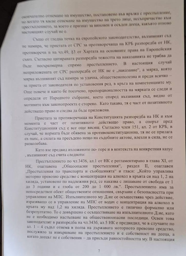 Първостепенният съд е отказал да приложи материалния закон в частта, постановяваща отнемане на „ превозното средство, послужило за извършване на престъплението", на първо място поради противоречие на принципите, залегнали в член 53 от НК и цитираната разпоредба. Приел е, че законодателната техника е погрешна, тъй като с член 343б, ал. 5 от НК вместо предмет, лекият автомобил е третиран като средство на престъплението, в отклонение на утвърдената практика на ВКС.