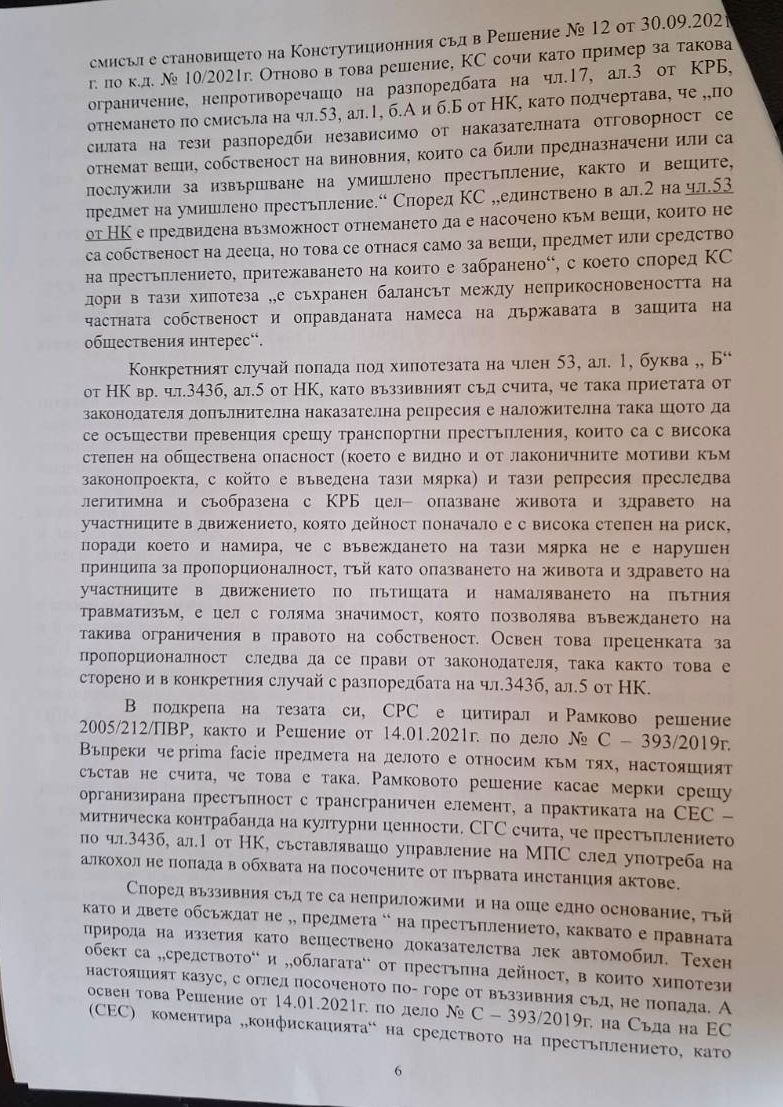 На второ място, СРС е счел, че нормата е непропорционална с оглед на инкриминираната престъпна дейност и целите, които преследва. СГС счита, че принципът за пропорционалност, залегнал в мотивите на Решение Nº 8 от 15.11.2019г. на КС, е спазен. Репресивната мярка е приета в отговор на пътния травматизъм в държавата, критериите, при които се налага са обективни, ясни, недискриминиращи. Още повече, погрешно контролираната инстанция е счела, че нормата на член 53 от НК е наказание. Правната доктрина и съдебна практика с дълга давност са безпротиворечиви, че тази мярка притежава санкционен, превантивен характер, но не е наказание, въпреки репресивния си елемент. Аргумент в тази насока е и обстоятелството, че отнемането по цитирания текст се прилага независимо и отделно от наказателната отговорност, въпреки че това винаги се осъществява само при извършено престъпление. В този смисъл юридически ирелевантен с аргумента на СРС, че ,,мярката" /която първостепенният съд погрешно е приел за наказание/ не е подчинена на правилата за индивидуализация на наказанието в НК и не е съобразена с тежестта на деянието. Този въпрос при мерките по член 53 от НК е решен дефинитивно, тъй като те са отговор, държавна реакция с елемент на държавна принуда при регулиране на определени обществени отношения, каквито са процесните - безопасността на транспорта.