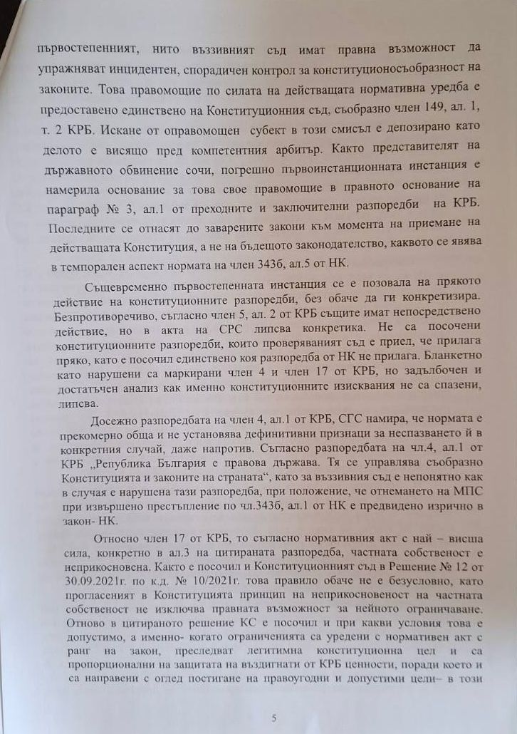 Безпротиворечиво, съгласно член 5, ал. 2 от КРБ същите имат непосредствено действие, но в акта на СРС липсва конкретика. Не са посочени конституционните разпоредби, които проверяваният съд е приел, че прилага пряко, като е посочил единствено коя разпоредба от НК не прилага. Бланкетно като нарушени са маркирани член 4 и член 17 от КРБ, но задълбочен и достатъчен анализ как именно конституционните изисквания не са спазени, липсва.