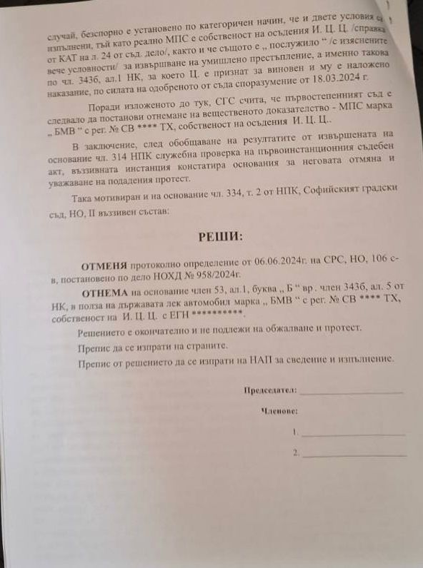 Софийският градски съд отмени определението на Софийски районен съд и реши да бъде отнет в полза на държавата лек автомобил, собственост на Ивайло Цветков (Нойзи). Решението е окончателно и не подлежи на обжалване и протест.