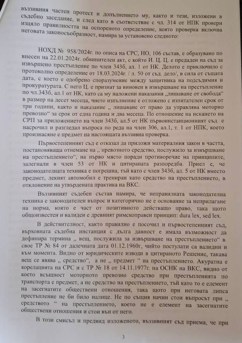 НОХД Nº 958/2024 г. по описа на СРС, НО, 106 състав, с образувано по внесен на 22.01.2024г. обвинителен акт, с който И. Ц. Ц. е предаден на съд за извършено престъпление по член 343б, ал. 1 от НК. Делото е приключило с протоколно определение от 18.03.2024г. / л. 50 от съд. дело/, в сила от същата дата, с което е одобрено споразумение между защитника на подсъдимия и прокуратурата. С него Ц. е признат за виновен в извършване на престъпление по чл.3436, ал. 1 от НК, като са му наложени наказания „лишаване от свобода" в размер на десет месеца, чието изпълнение е отложено с изпитателен срок от три години, както и наказание , лишаване от право да управлява моторно превозно" за срок от една година и два месеца. По отношение на искането на СРП за приложението на член 343б, ал.5 от НК първоинстанционнният съд е насрочил и разгледал въпроса по реда на член 306, ал.1, т. 1 от НПК, което произнасяне е предмет на настоящата въззивна проверка.