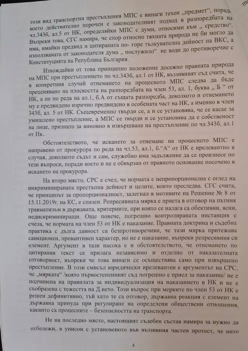 Досежно разпоредбата на член 4, ал.1 от КРБ, СГС намира, че нормата е прекомерно обща и не установила дефинитивни признаци за неспазването й в конкретния случай, даже напротив. Съгласно разпоредбата на чл.4, ал.1 от КРБ „Република България с правова държава. Тя се управлява съобразно Конституцията и законите на страната", като за въззивния съд е непонятно как в случая е нарушена тази разпоредба, при положение, че отнемането на МПС при извършено престъпление по чл.343б, ал. 1 от НК е предвидено изрично в закон- НК.