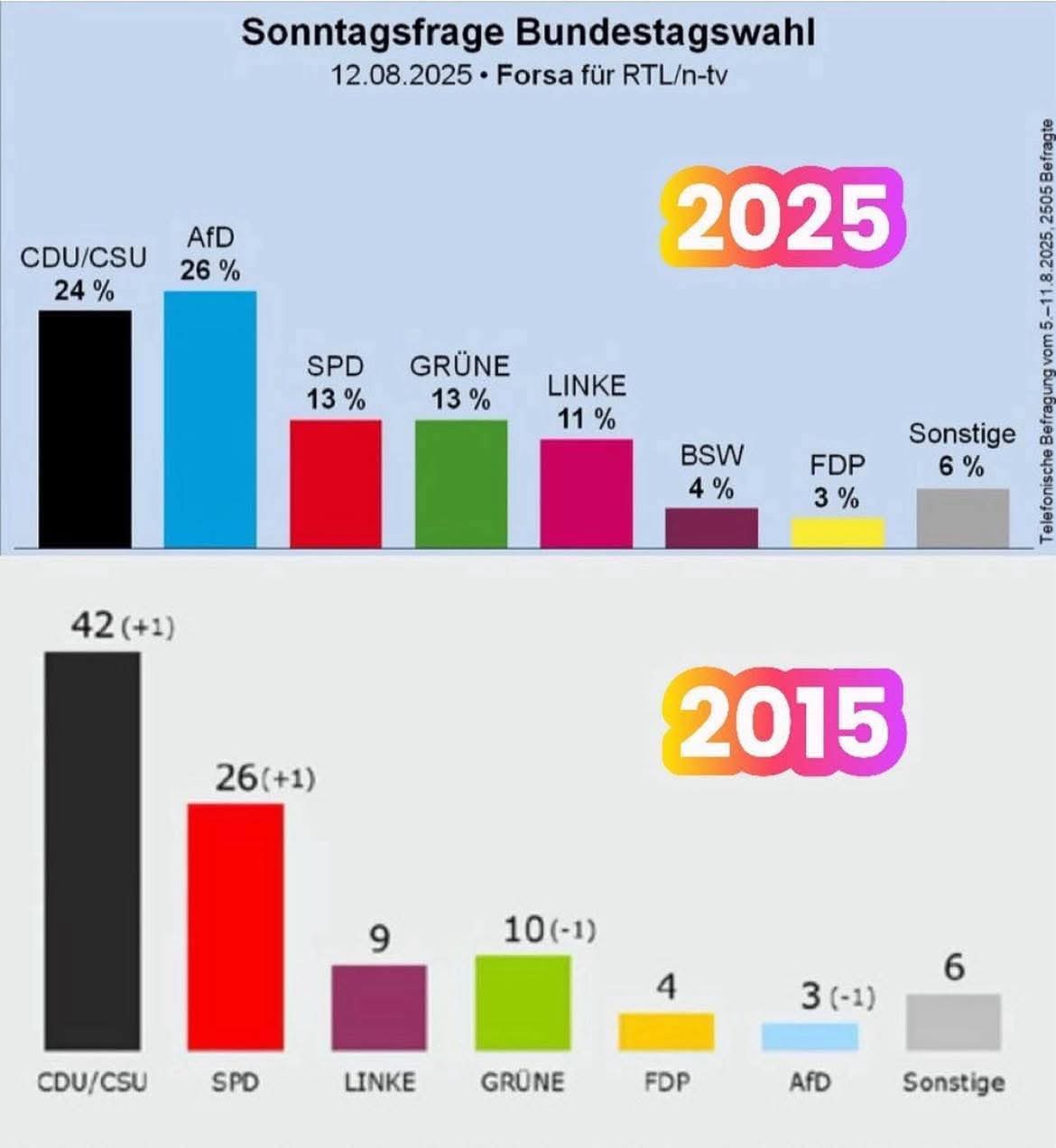 Как стана така, че с едва 3% през 2015 г., в 2025 г. вече всеки четвърти германец е от AFD? Ами стана след думите на Ангела Меркел "Елате, ще се справим" през 2015 г. И мигрантите наистина отидоха, а те не се справиха. Много християнска кръв се проля от миграцията на ножа, в това число и на малолетни.