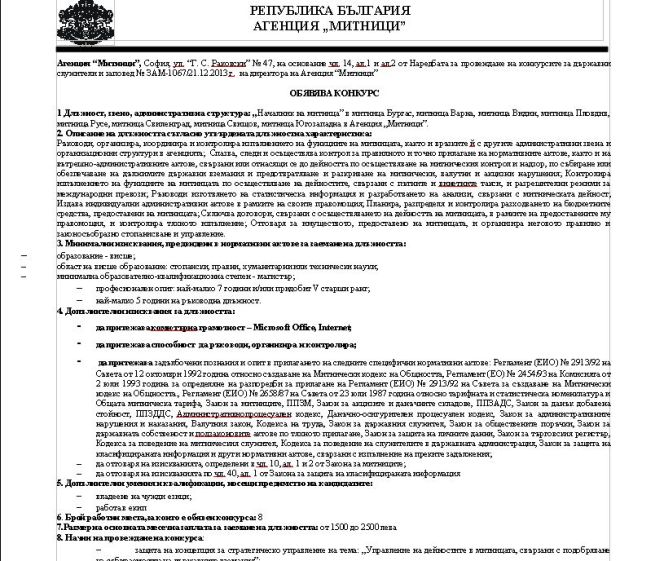 Оказа се, че босовете на апетитната институция са пуснали обява за състезанието за областни началници в 8 големи града на България, сред които София, Пловдив, Варна, Русе и Видин.