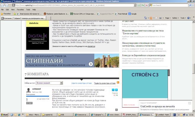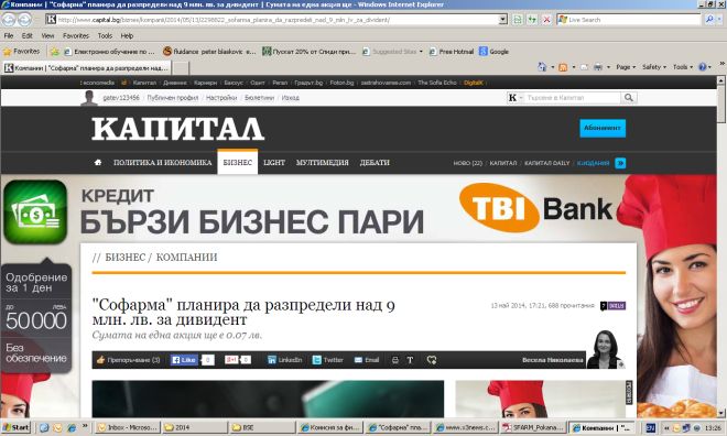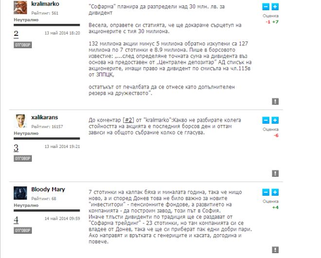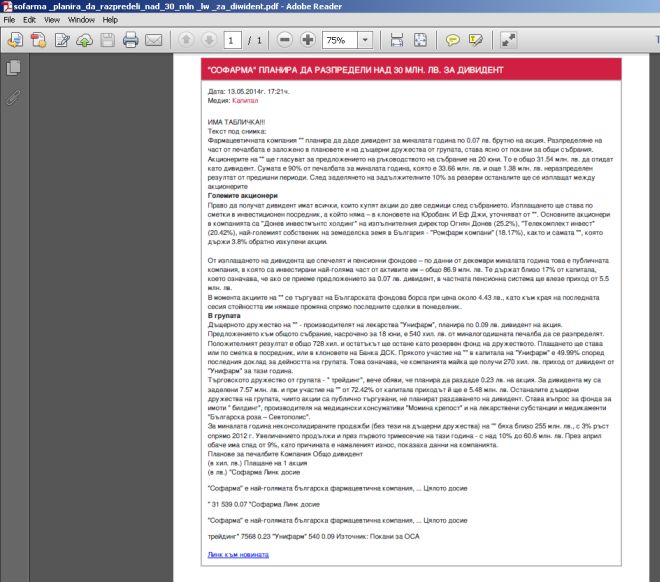 1. Първата статия, която беше свалена в последствие - Софарма планира да разпредели над 30 млн лв за дивидент, публикувана е в 17:21 часа на 13.05.2014г.