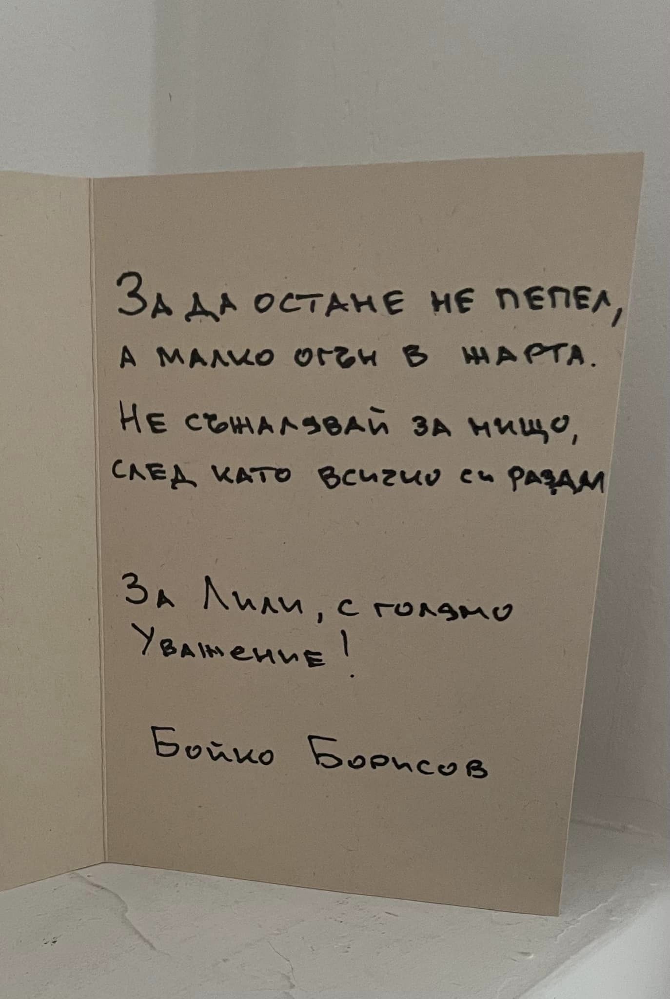 Първата изненада от бившия премиер Лили получила за 8 март, когато в дома ѝ пристигнали десетки букети от нейни почитатели, но този от Борисов се отличил. Затова и с него първо се похвали тя със снимка. Бившият премиер ѝ изпратил повече от 30 лалета със саморъчно надписана картичка. „…всичко пред теб, обичай, продължи!“, гласи посланието към букета.