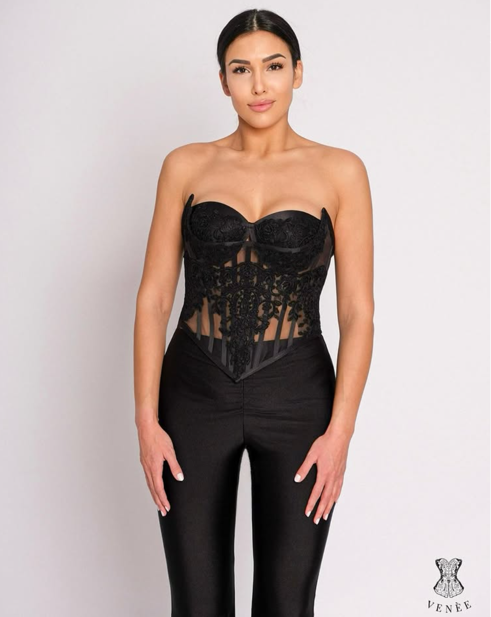На практика обаче брюнетката е заложила на едно - корсетите. Венцислава вече има онлайн бутик, макар и без сайт, без физически магазин и без обявени цени. Брандът носи името VENEE и се развива изцяло в социалните мрежи. До неотдавна в колекцията присъстваха само два модела - черни, силно вталени корсети с гръмките имена "Париж" и "Казабланка", изработени, по нейни думи, от висококачествени материали с фина дубайска дантела. И двата модела се предлагаха само в размери 36, 38 и 40 - тоест за фини и слабички дами.