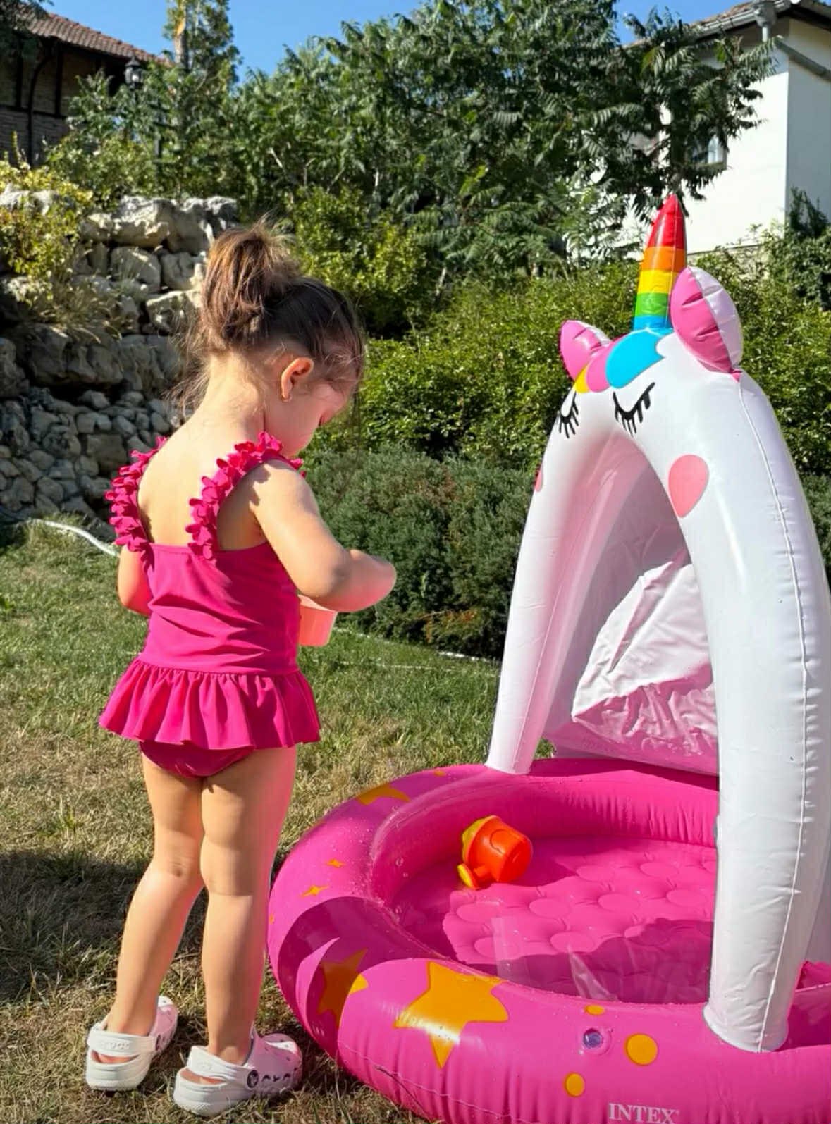 Лена Бориславова отново стана тема на коментари в социалните мрежи. Поводът този път не е политически, а битов. Депутатката от ПП публикува снимки на дъщеря си Деа, която играе в горещ летен ден край надуваемо басейнче, облечена в сладък розов бански и с маркови чехли.