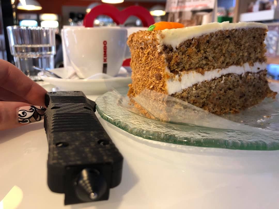От фотосите на Мартина се вижда, че редовно си позволява да посещава ресторанти, кафенета и сладкарници, въоръжена до зъби, а освен това позира и с автомат в ръка. 25 години по-младата от 54-годишния учиндолец блондинка не се притеснява да се появява на публични и оживени места с ножове за по 2 хиляди и нагоре лева. Още по-скандалното е, че нахаканата Мартина не просто носи хладни оръжията в чантата си, а най-демонстративно ги поставя на масите в заведенията, които посещава, редом до сутрешното си кафе с парче десерт. От снимките ясно си личи, че въоръжена като за война, тя се перчи в сладкарници, молове и ресторанти, където е претъпкано с родители и малки деца, а размахването на оръжие е повече от недопустимо.