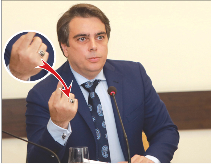 Асен Василев от години носи мистериозен пръстен на дясната си ръка, а в социалните мрежи мнозина смятат, че става дума за масонско бижу. Аксесоарът е изработен от благороден метал, а върху него са гравирани три ленти, които вероятно притежават тайнствена символика, с която е запознат само собственикът на пръстена. Василев не се разделя с бижуто никога и по никакъв повод и го носи още от младежките си години, вижда се от негови архивни снимки.