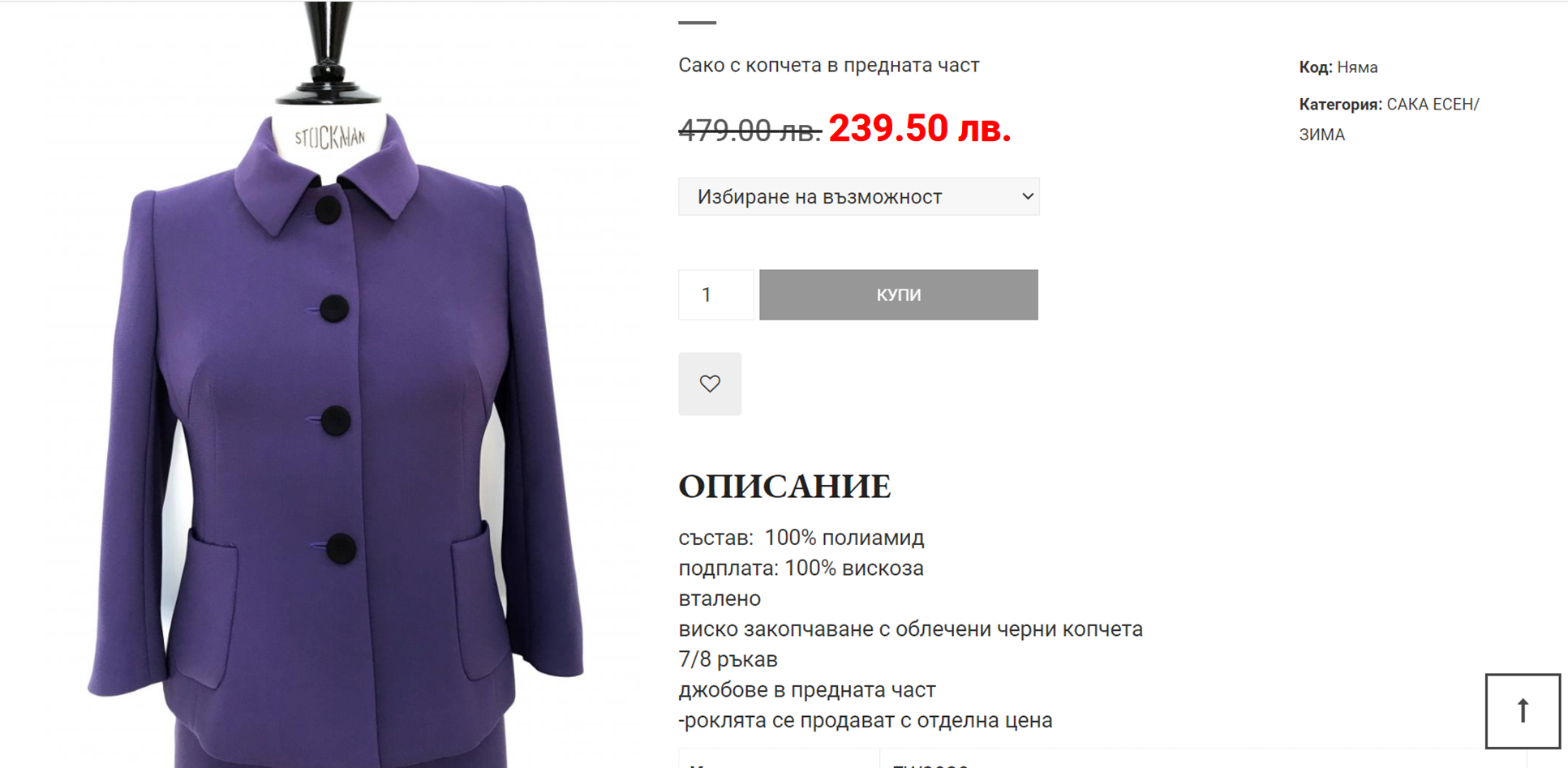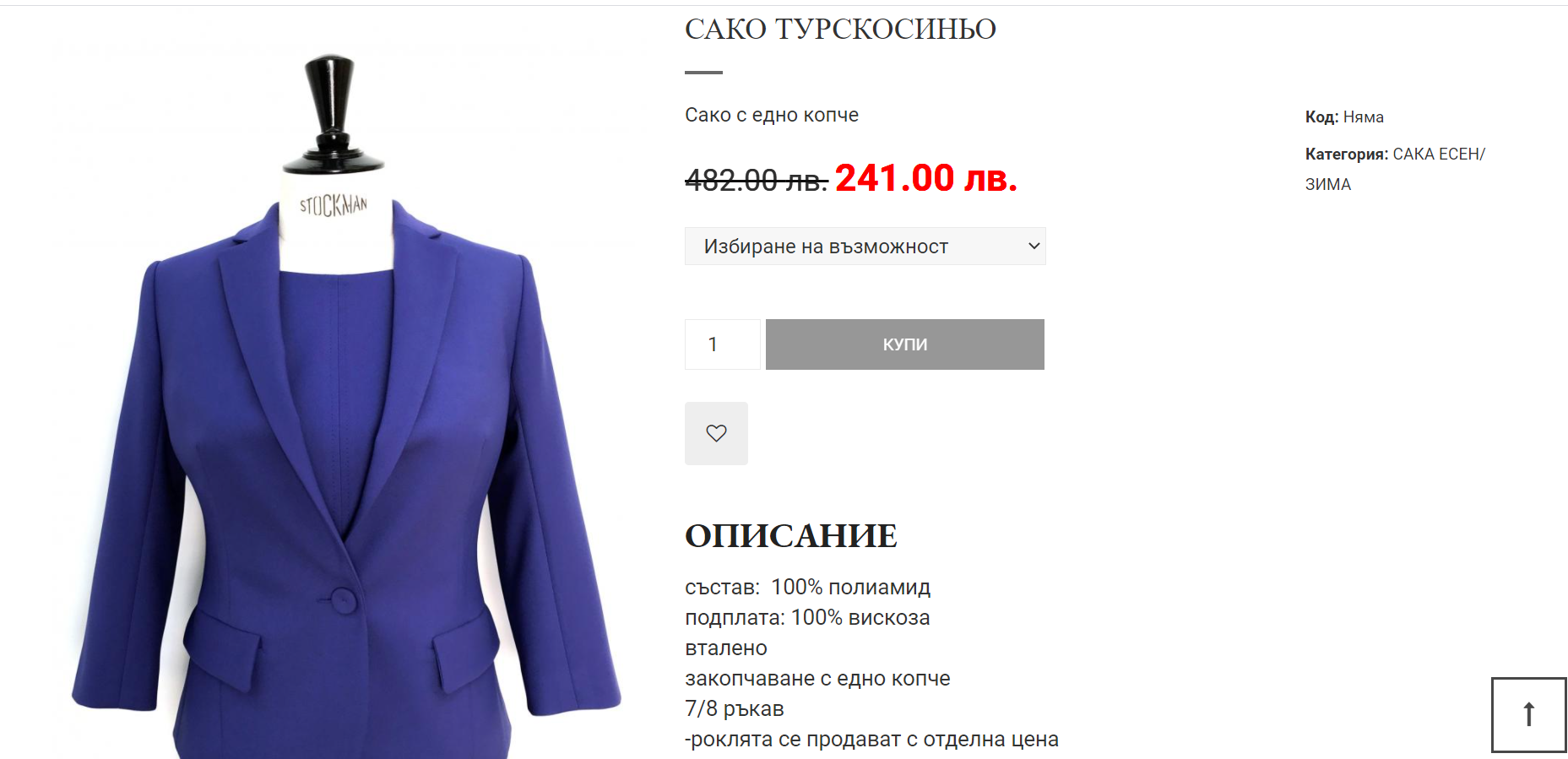 Сходен модел кюстендилката има и в турскосиньо, а стойността му пак е над 800 лева за двете части – сако и рокля.