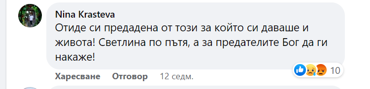 „Нина приживе беше мъртва заради предателството на Ангел. Светъл ѝ път и съболезнования за останалите ѝ близки. Поклон!“, пише приятелката ѝ Руми Милева във фейсбук профила ѝ. „Отиде си предадена от този, за когото си даваше и живота си! Светлина по пътя, а за предателите – Бог да ги накаже“, пише дама на име Нина Кръстева.
