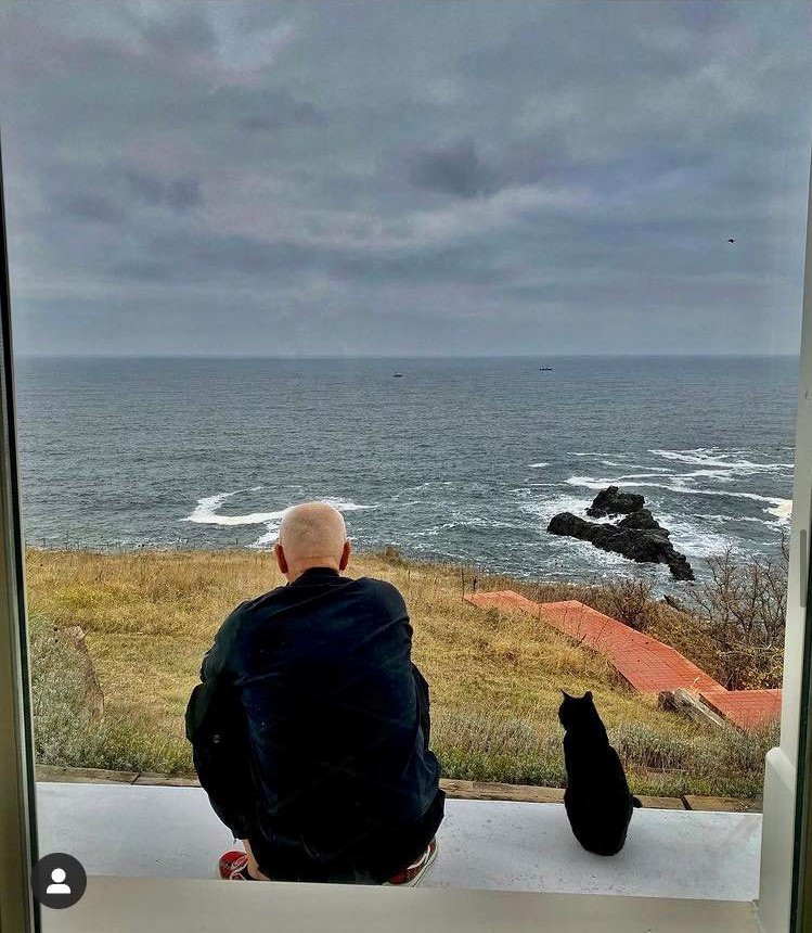 Николай Събев се наслаждава на гледката в компанията на котката си