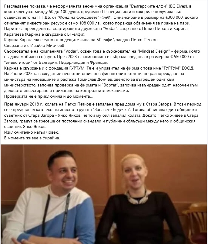 Разследване показва, че неформалната анонимна организация "Българските елфи" (BG Elves), в която членуват между 50 до 100 души, предимно IT специалисти и хакери, е получила със съдействието на ПП ДБ, от "Фонд на фондовете" (ФнФ), финансиране в размер на €300 000, докато отчетеният инвестиран ресурс е само 108 000 лв., което поражда обвинения за пране на пари.