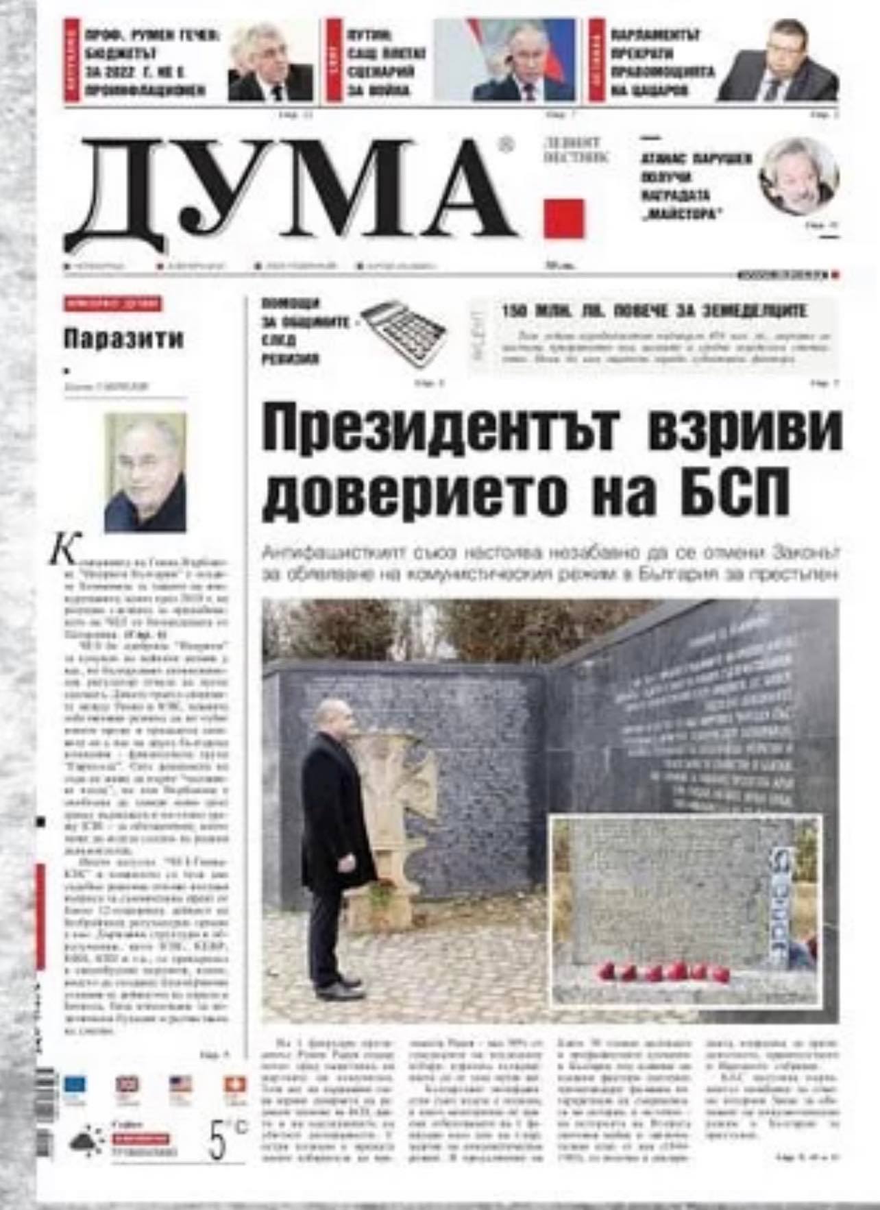 Става дума за партийния вестник на БСП - "Дума", чиято първа страница изгря със заглавието "Президентът взриви доверието в БСП". В статията се казва, че с отдаването на почти пред паметника на жертвите на комунизма Радев е срещнал неодобрението на редовите членове на БСП, като мнозина леви избиратели изразили възмущението си от този негов акт.